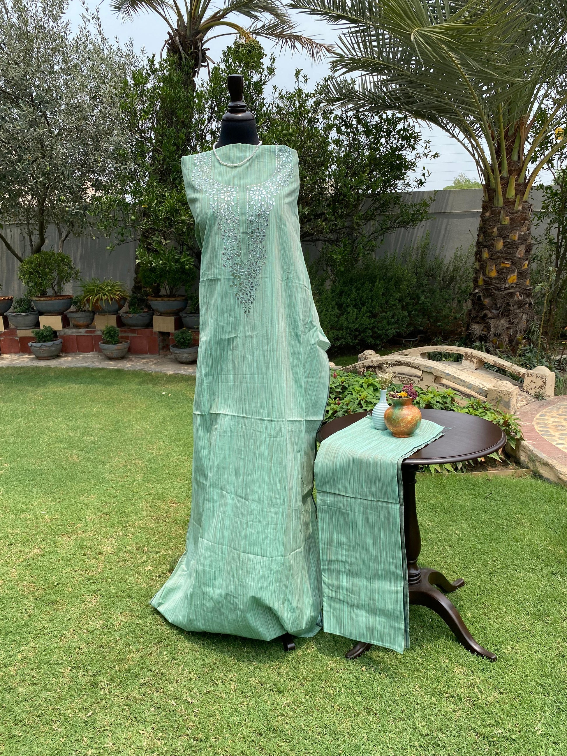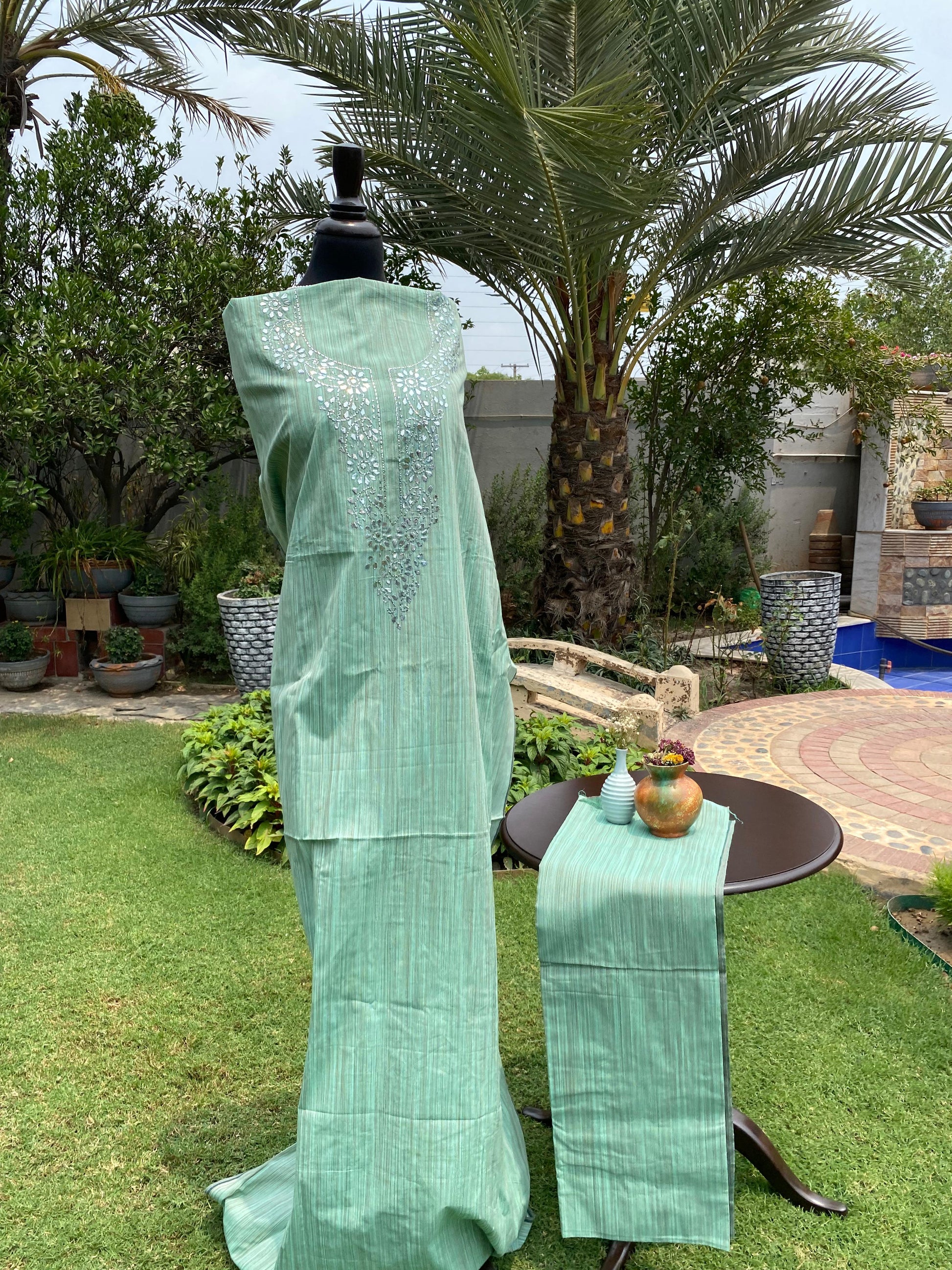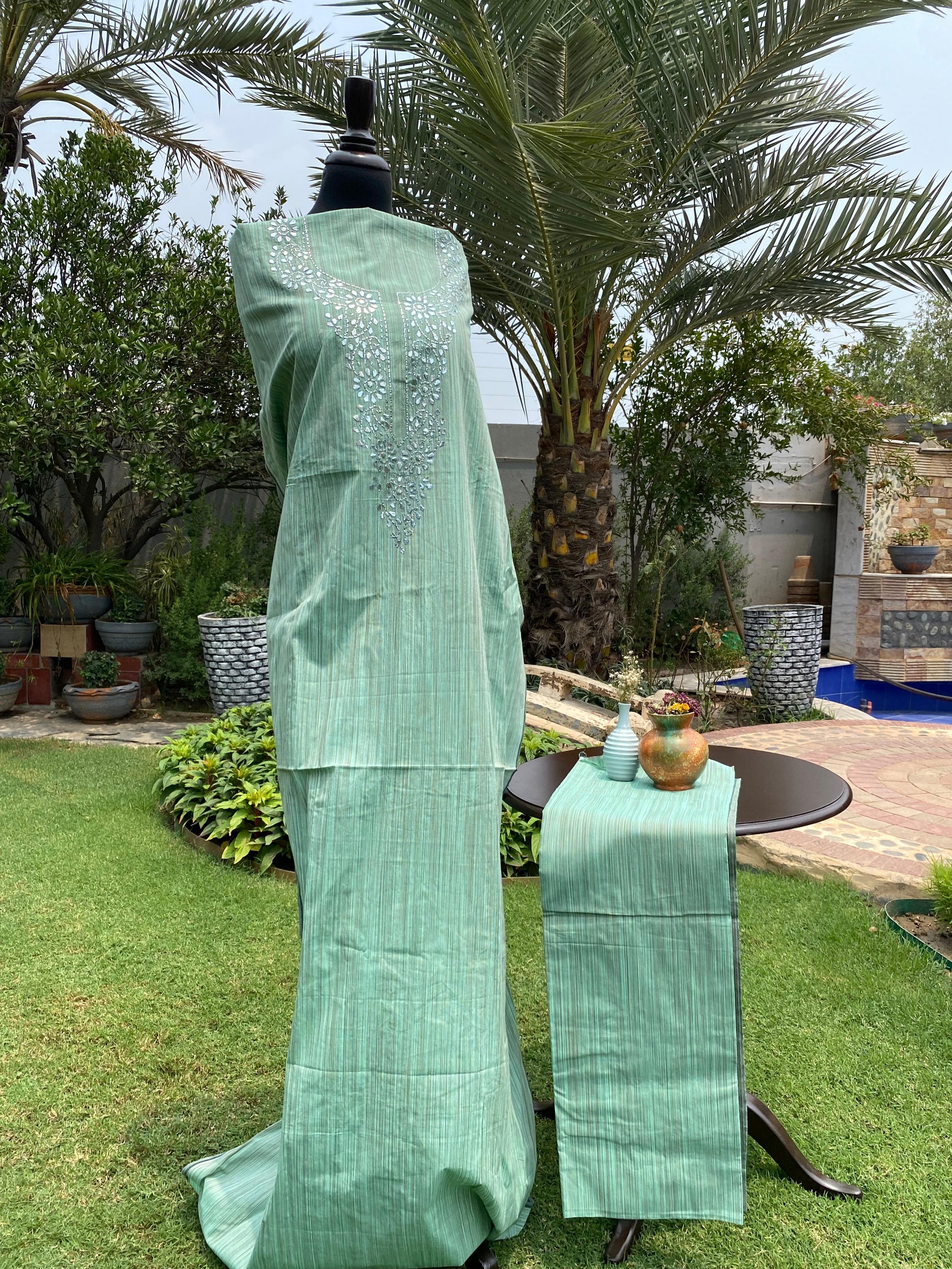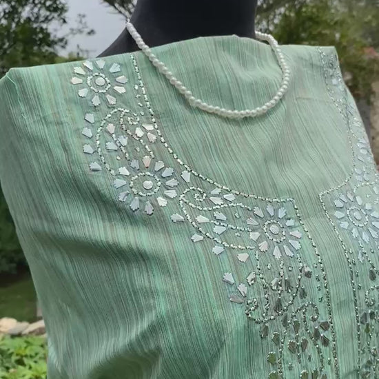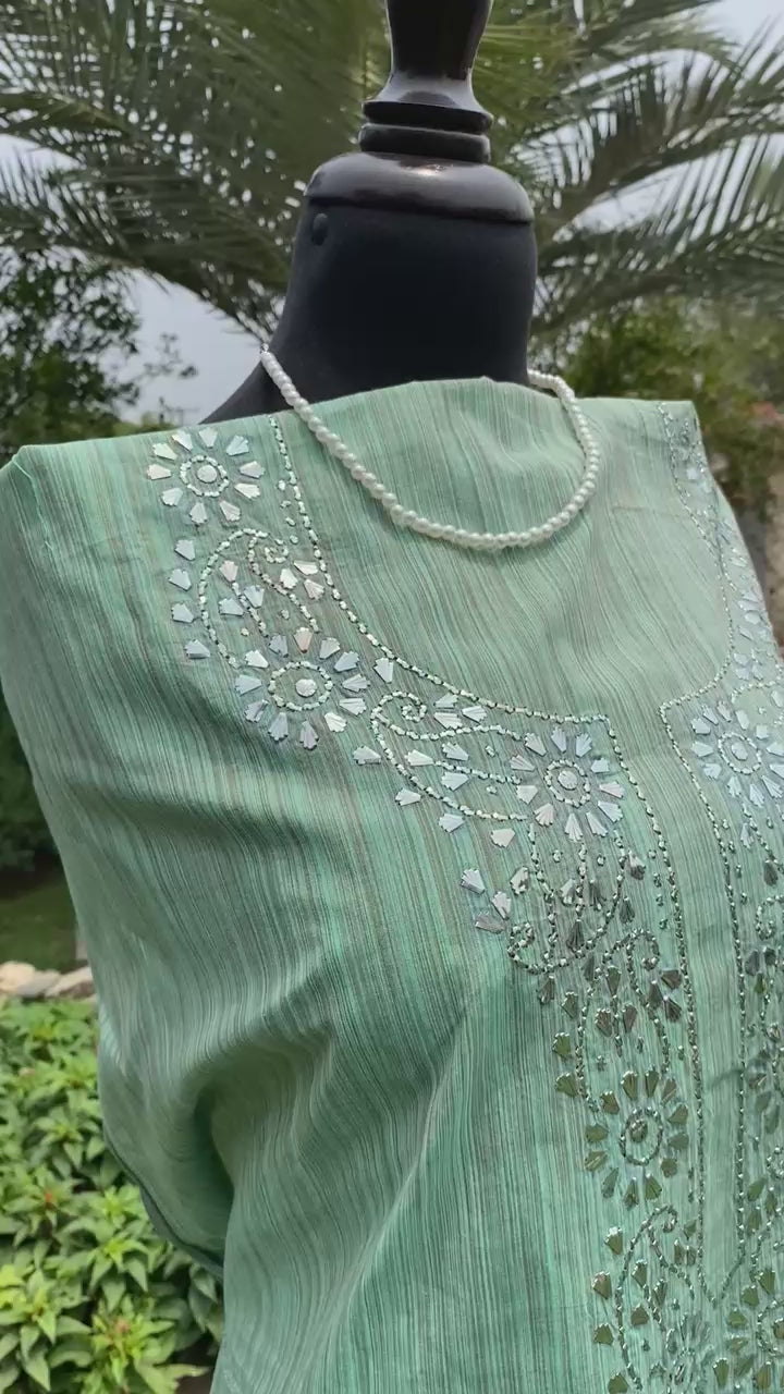 Crafted from high-quality lawn fabric, it ensures breathability and softness, perfect for warm climates. The suit features intricate handmade embroidery paired with delicate mukaish work, highlighting skilled craftsmanship and attention to detail. Being unstitched, it offers the flexibility to tailor each piece to your exact measurements.