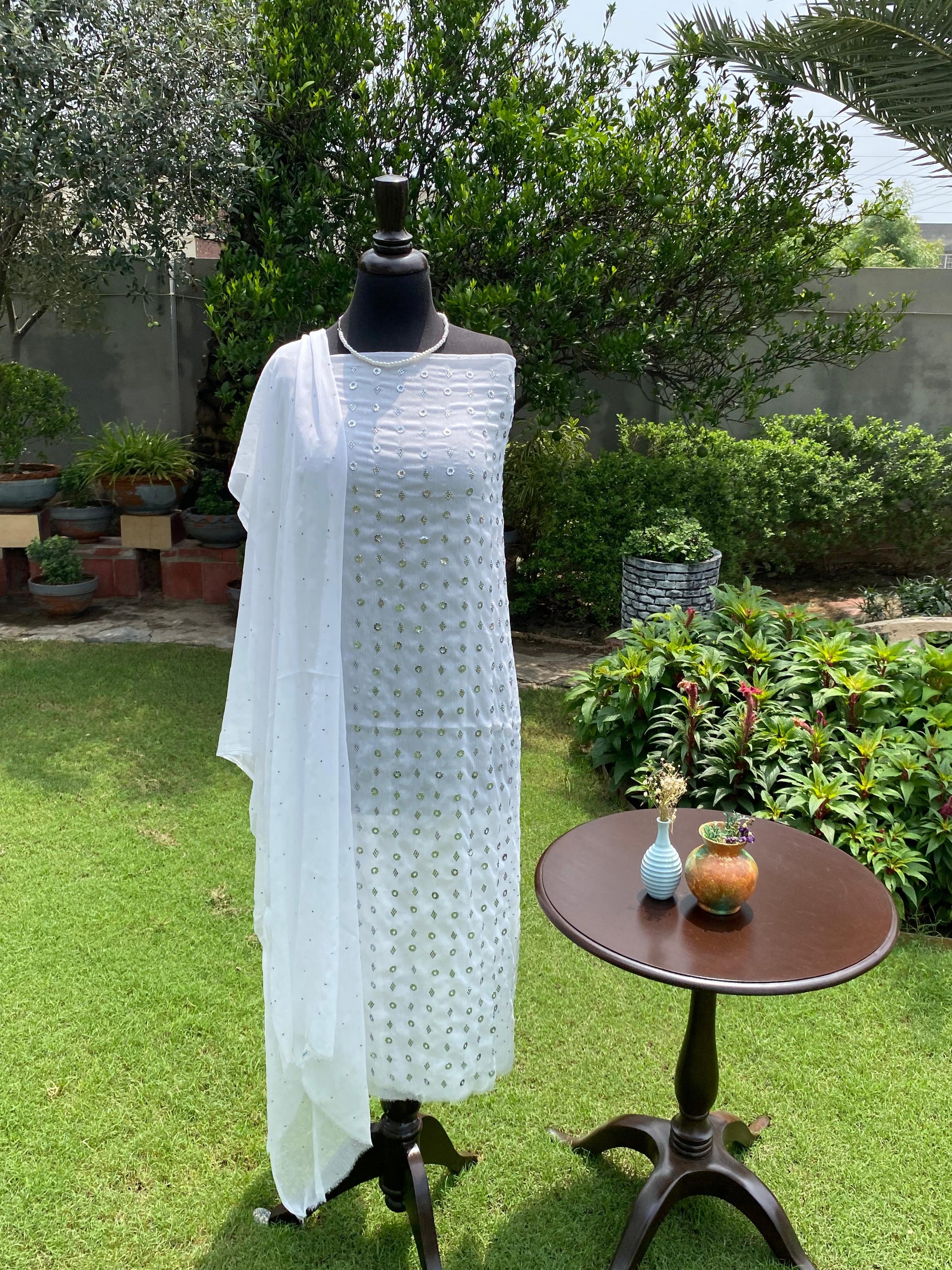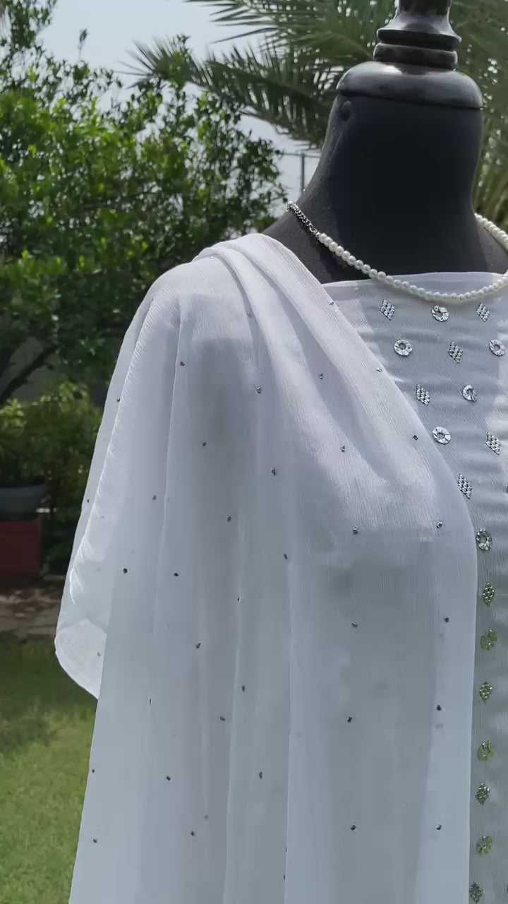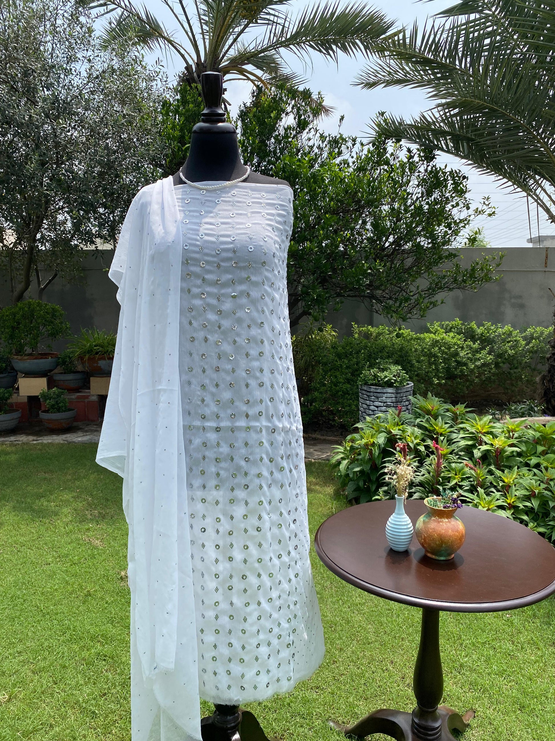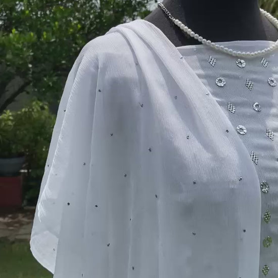 This stunning 2-piece suit is crafted from premium chiffon and features exquisite handmade Mukaish embroidery, adding a touch of traditional charm and sophistication. The classic white color enhances its graceful appeal, making it perfect for festive occasions, casual gatherings, or elegant summer wear. A timeless piece that beautifully blends tradition with elegance.