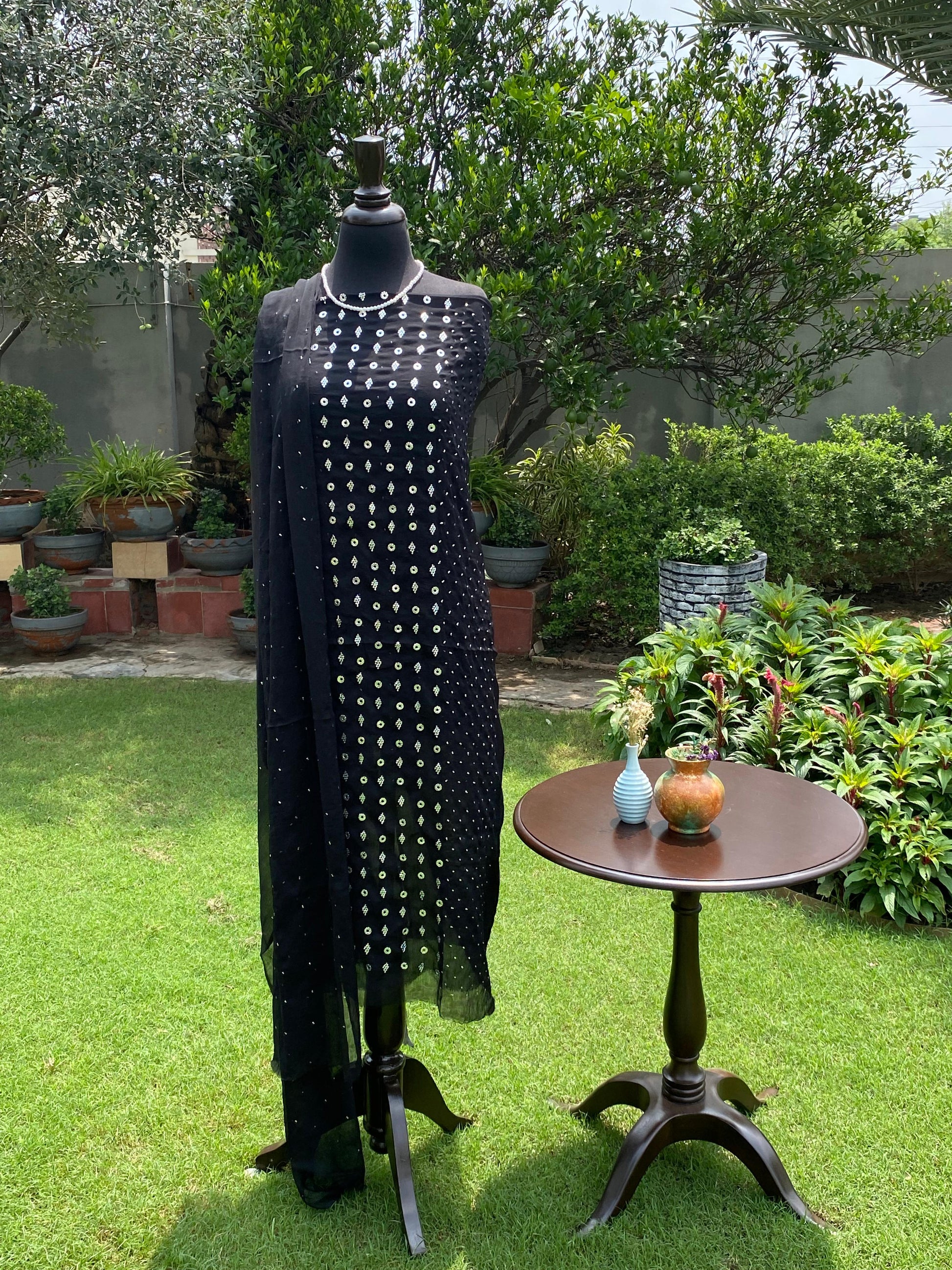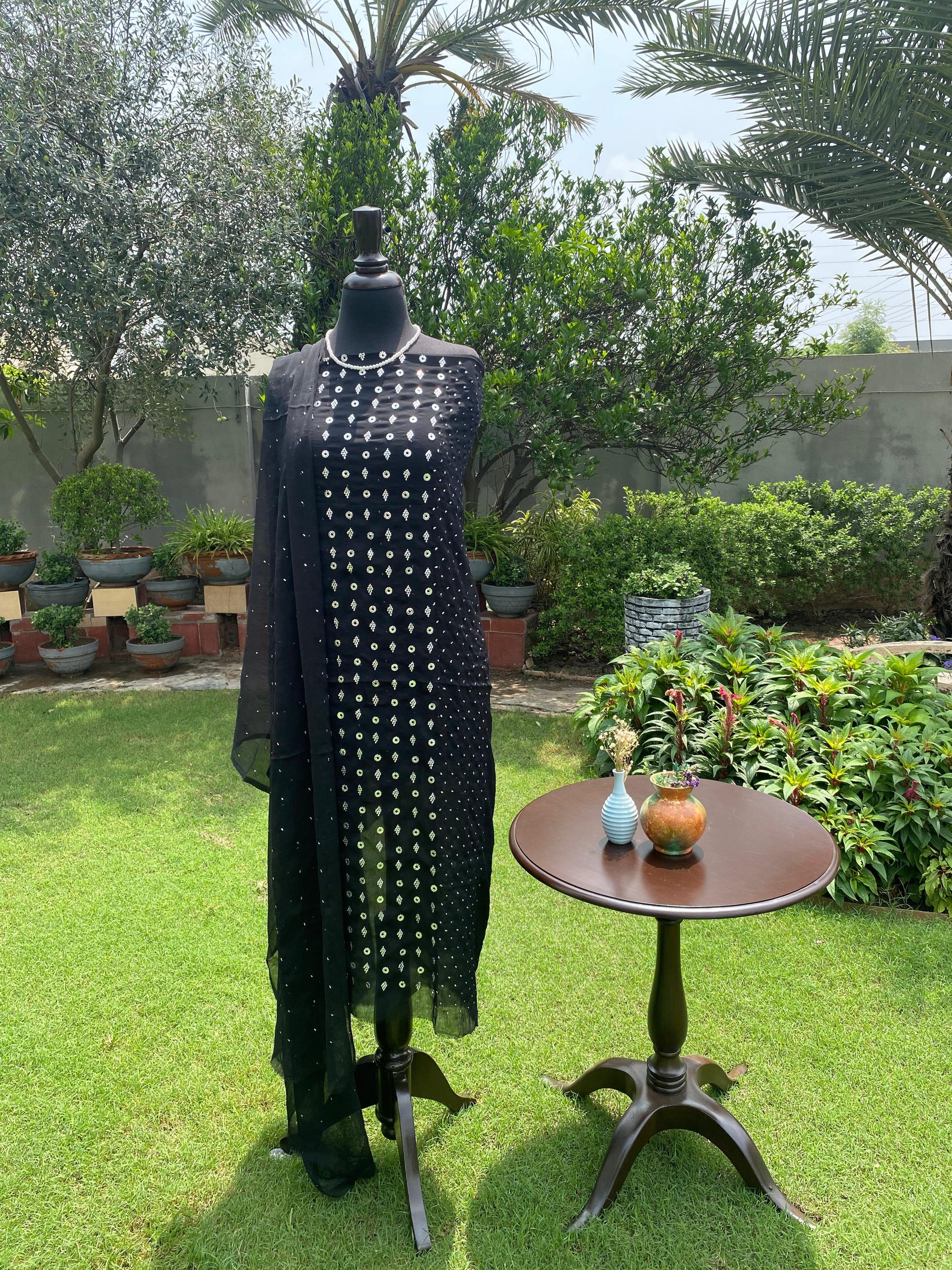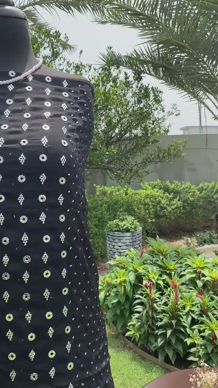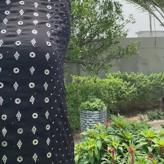 Elevate your wardrobe with this elegant black chiffon 2-piece suit, beautifully adorned with intricate Mukaish hand embroidery. The deep black hue adds a touch of timeless sophistication, perfect for both formal evenings and festive occasions. Crafted with attention to detail and tradition, this outfit offers a graceful blend of heritage and modern elegance. Limited stock – only 3 pieces available.