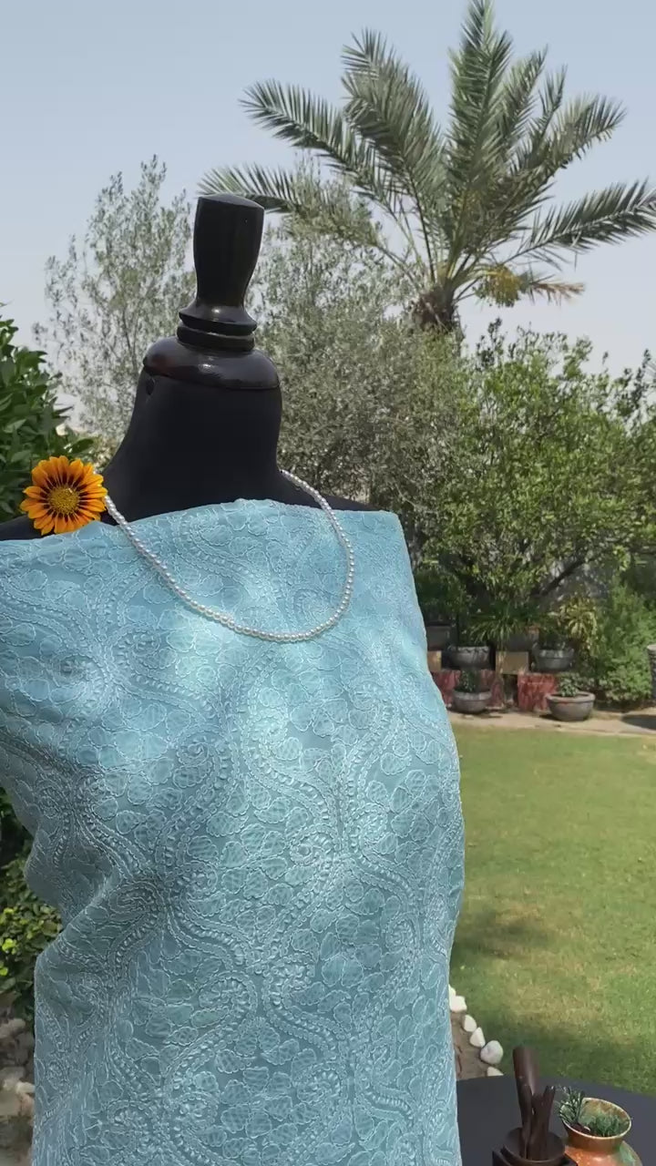 Experience the elegance of premium Indian handmade lawn fabric in a soothing sky blue shade. Crafted from pure cotton lawn, this unstitched shirt piece offers exceptional breathability and comfort, ideal for warm climates. The intricate hand embroidery adds a refined, artisanal touch, showcasing skilled craftsmanship and attention to detail. Perfect for creating a bespoke garment that combines traditional artistry with modern style, this fabric ensures both durability and a luxurious feel.