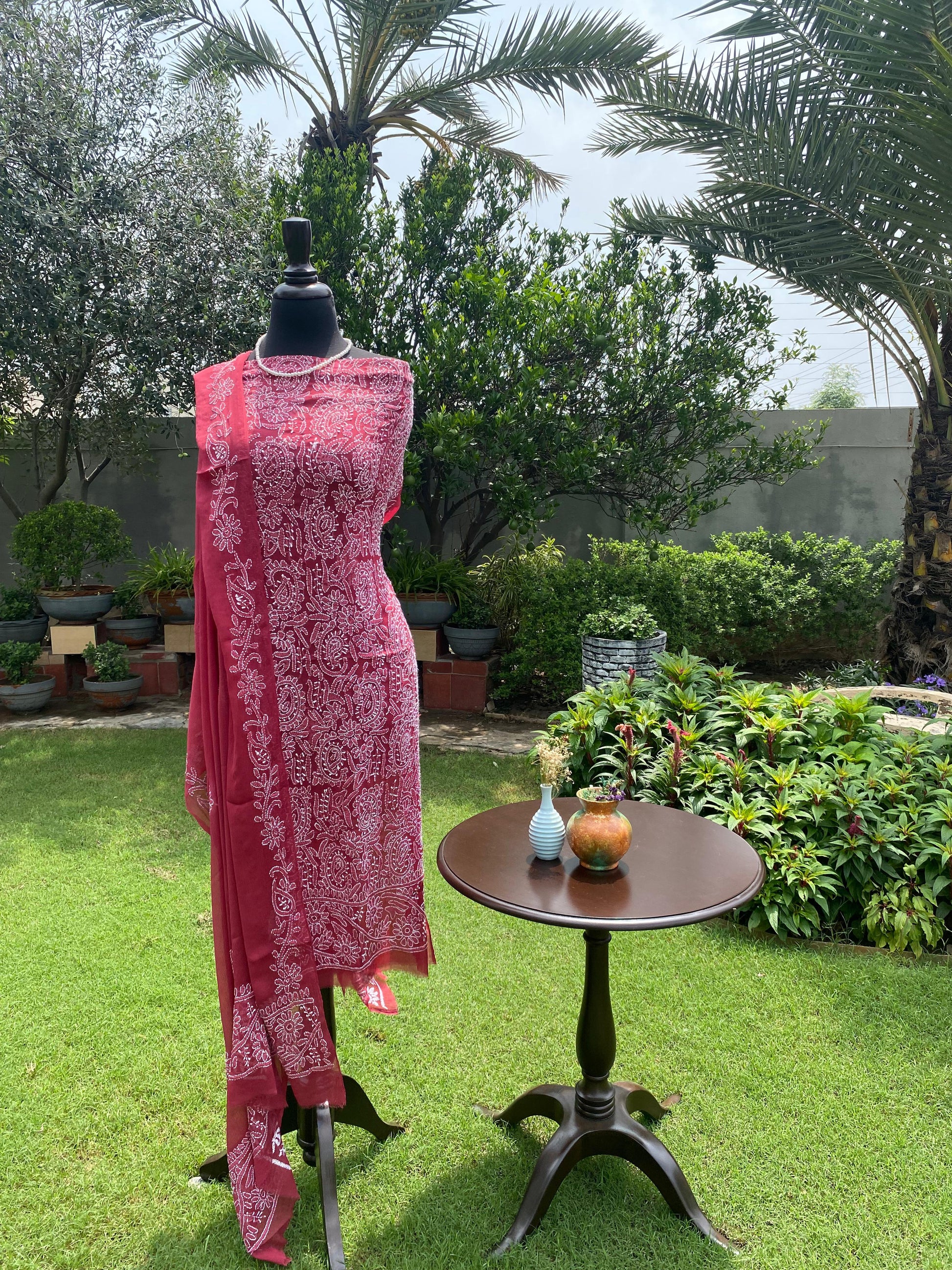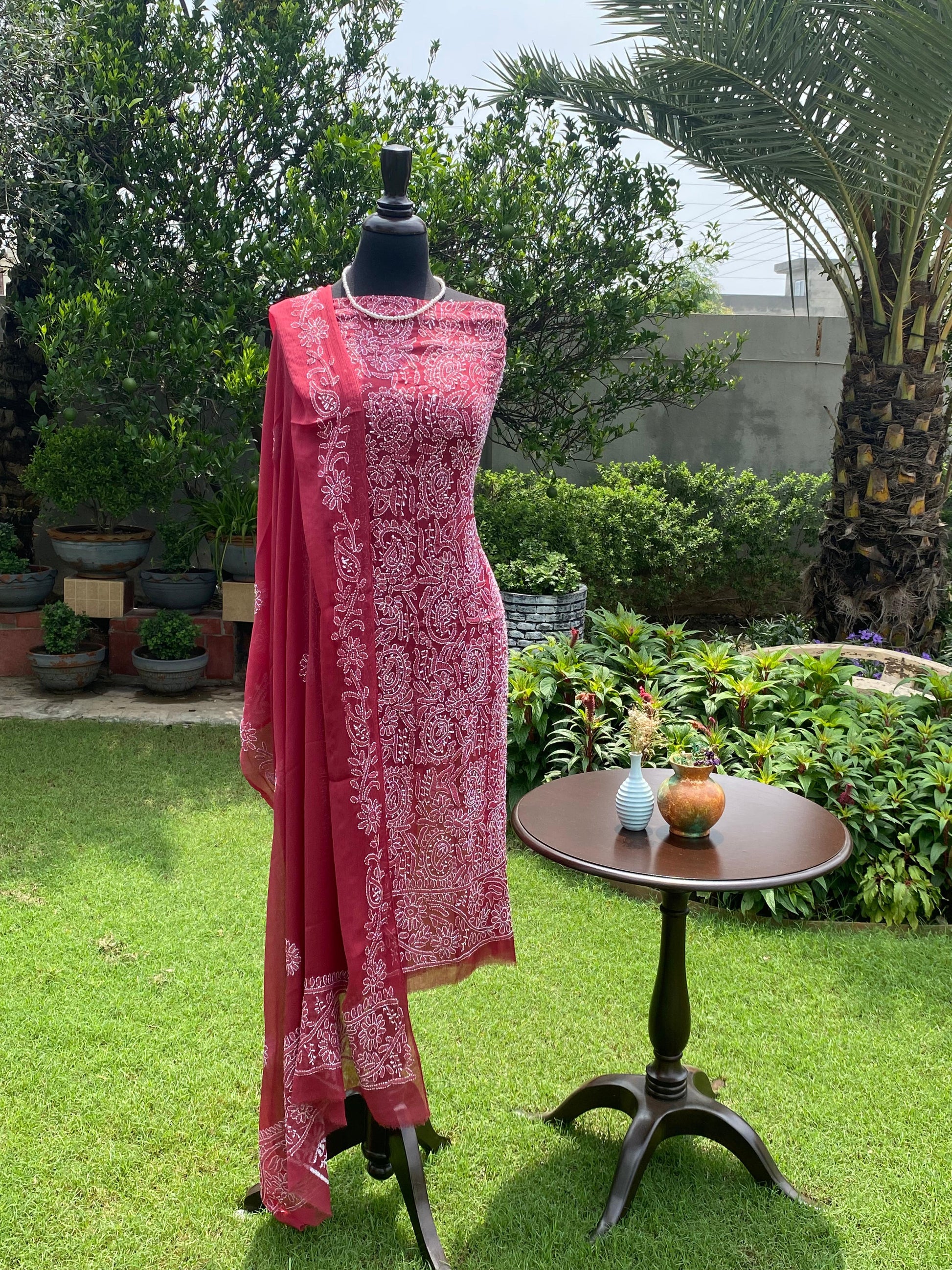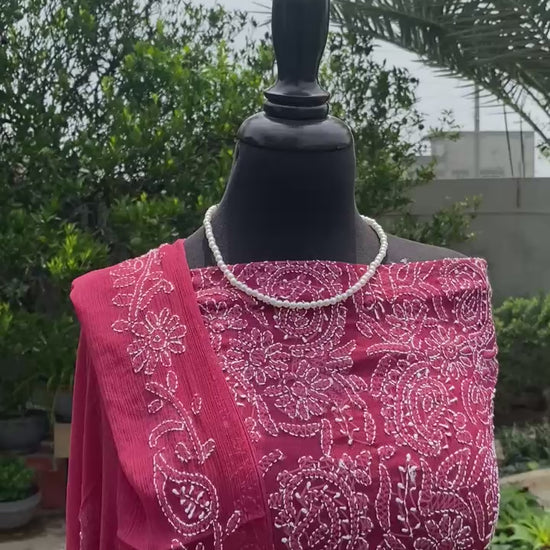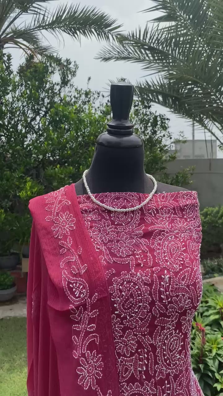 This elegant 2-piece suit features detailed handmade Dhaga embroidery on a beautiful purplish maroon base. A perfect blend of traditional craftsmanship and bold color, ideal for festive and semi-formal occasions.